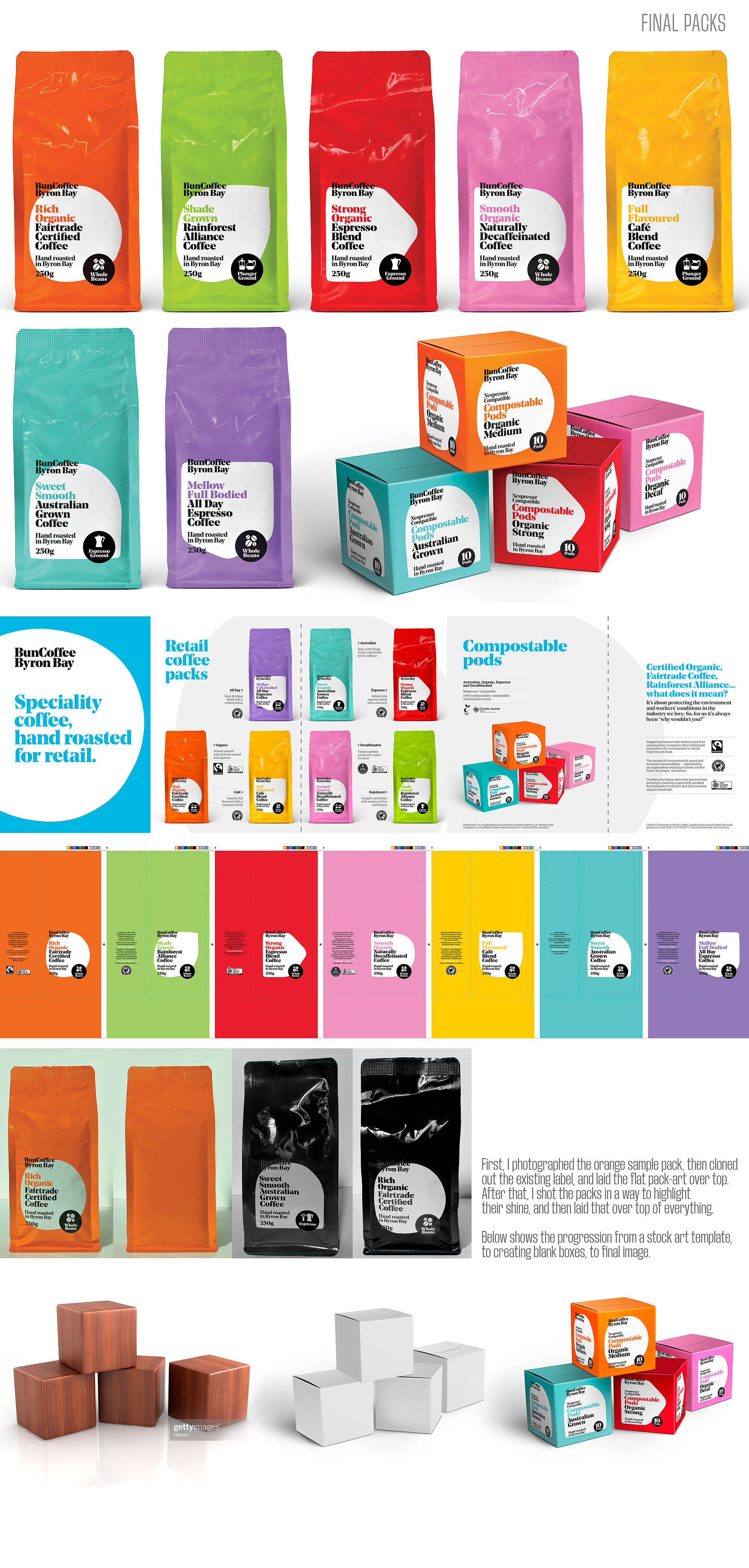 I photographed one pack as a base, then photographed various highlights and shines. Using that and flat vector artwork, I made the packs look different to each other. Bun Coffee, Byron Bay