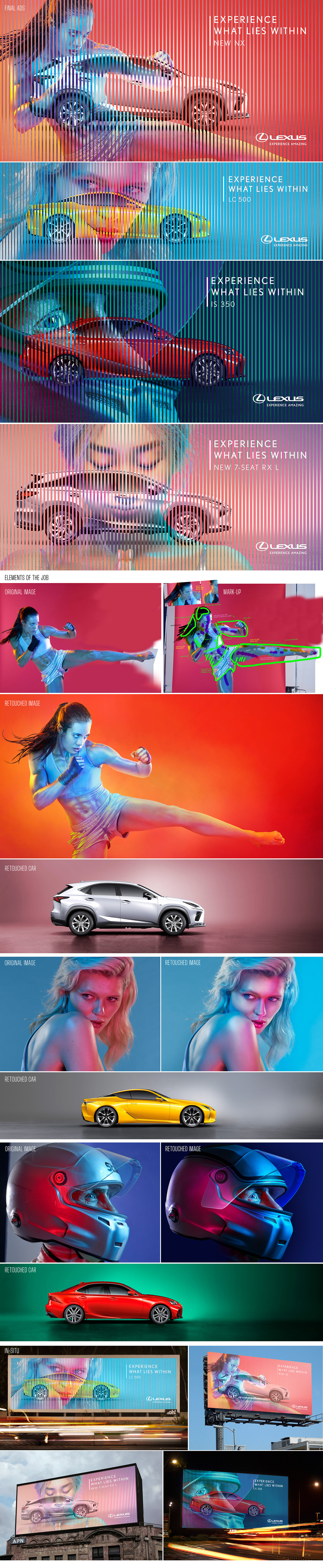 This was tricky. I had to retouch both the talent and the cars in an exaggerated style, so that each component could be equally easily read through the stripes. Lexus, M&C Saatchi Sydney