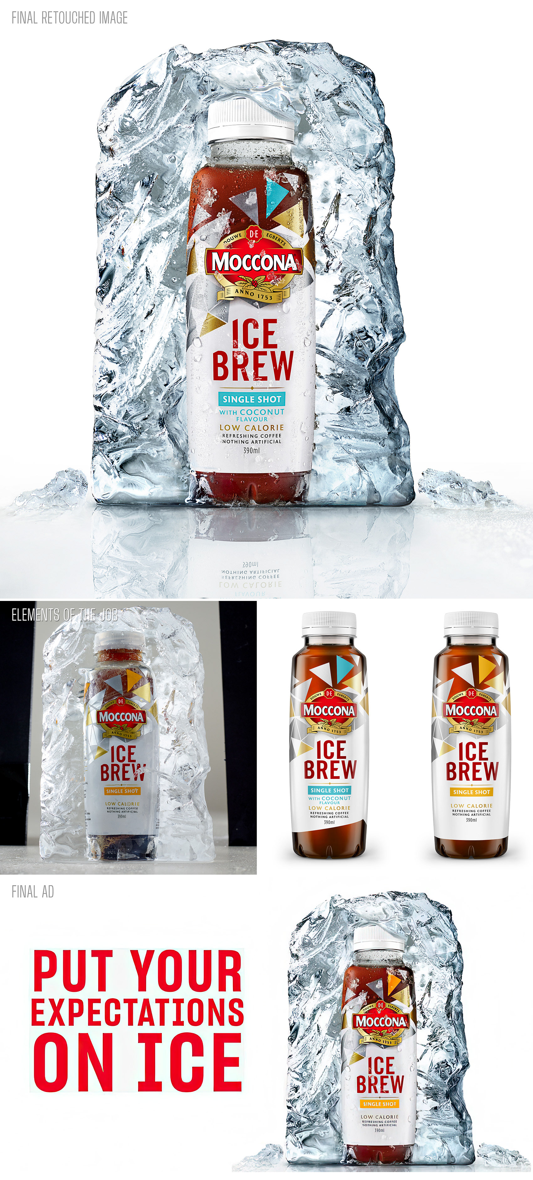 Compositing and grading, mainly. The photographer shot lots of bottles frozen in ice at varying stages of melting. Moccona, M&C Saatchi Sydney