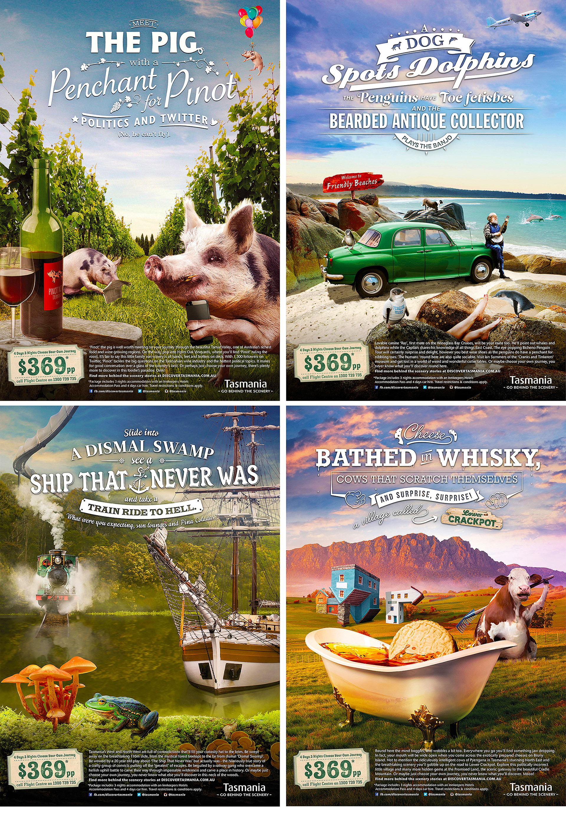 A humorous campaign for Tasmanian Tourism. Surreal imagery juxtaposed in a cartoonish composition. I had to deep-etch that bloody ship by hand! It took ages!